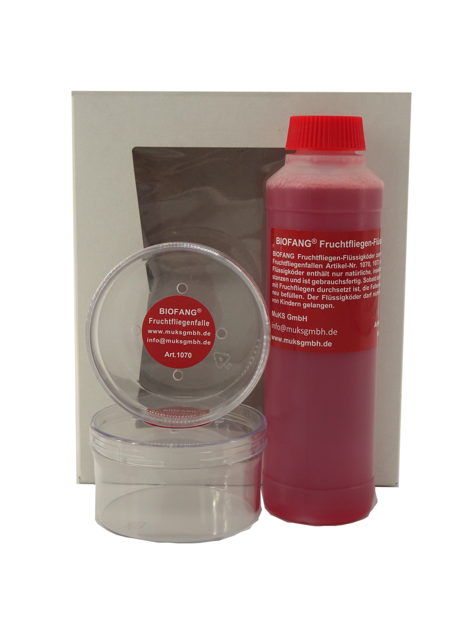 2 Stück mit Bajonettverschluss versehene Fruchtfliegenfallen, zum Stellen (nachfüllbar) zur insektizidfreien Beseitigung von lästigen Fruchtfliegen, mit 1 Flasche Flüssigköder 250 ml. Der Flüssigköder enthält nur natürliche Substanzen und ist gebrauchsfertig. Die transparenten Dosen erlauben eine sichtbare Befallskontrolle.