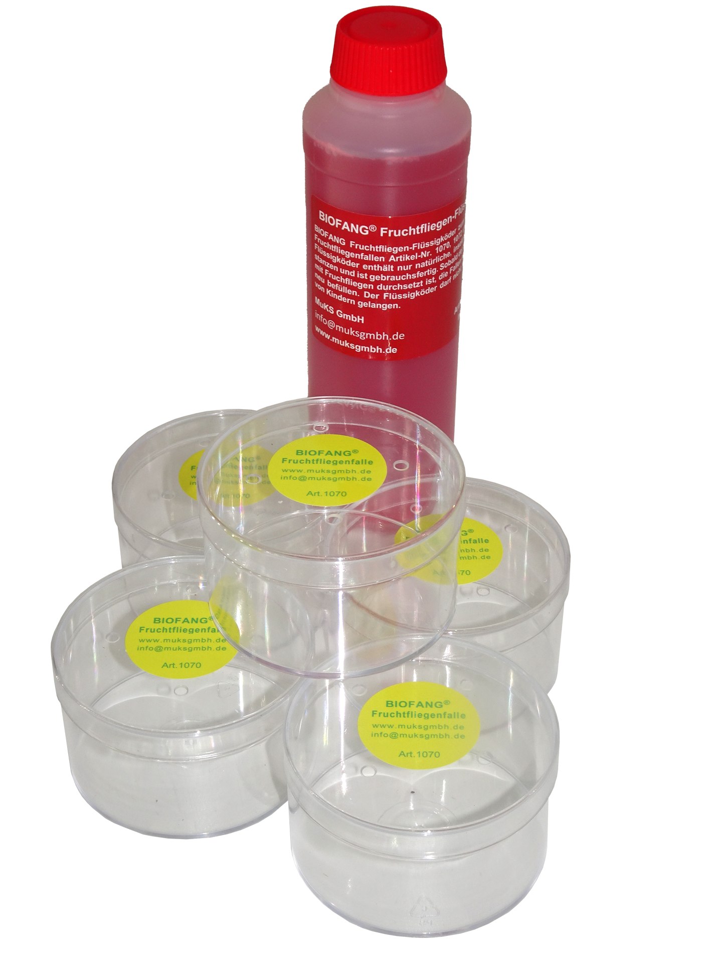Kleine runde Fruchtfliegenfallen zum Stellen (nachfüllbar), zur insektizidfreien Beseitigung von lästigen Fruchtfliegen, mit 1 Flasche Flüssigköder 250 ml. Der Flüssigköder enthält nur natürliche Substanzen und ist gebrauchsfertig. Die transparenten Dosen erlauben eine sichtbare Befallskontrolle.