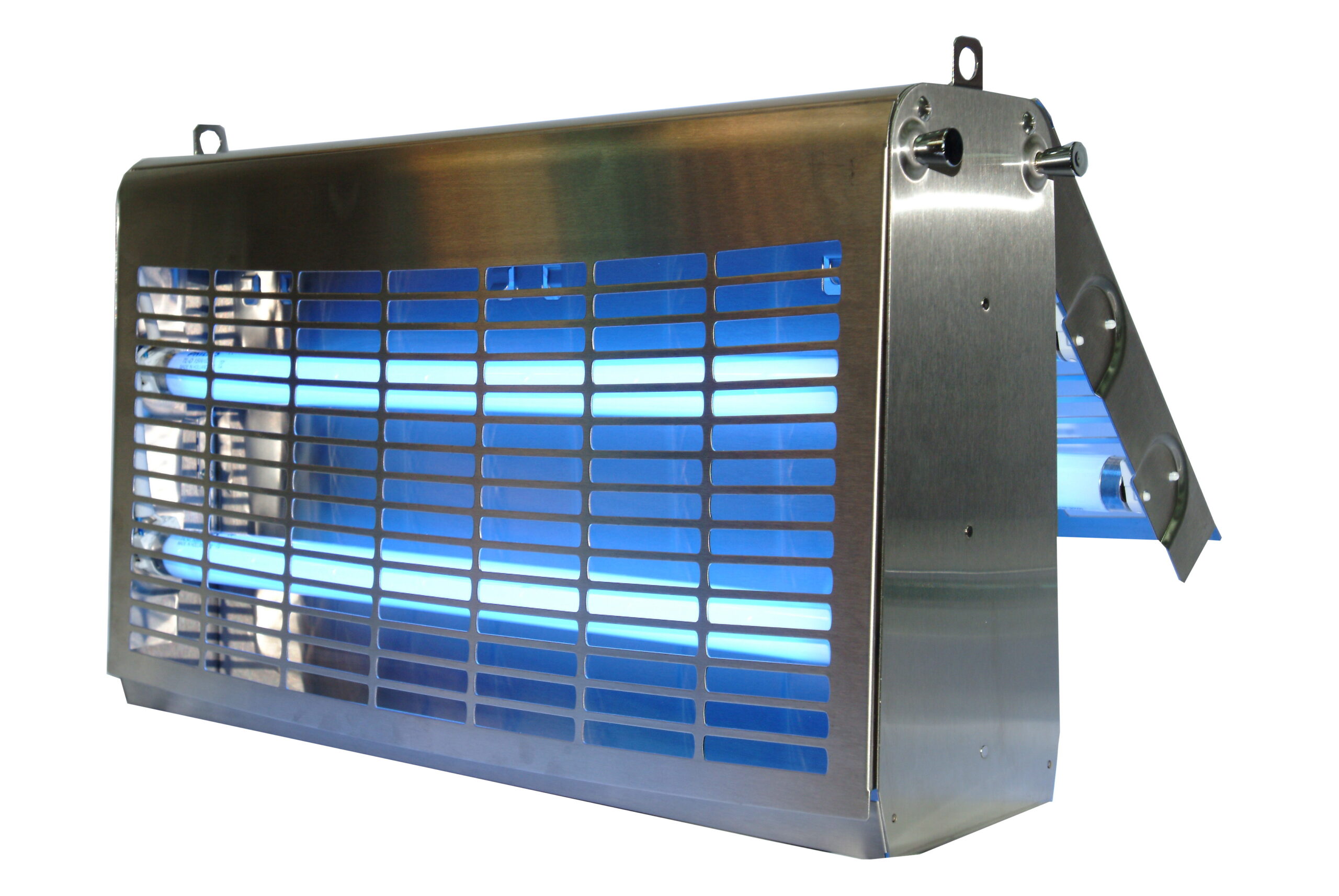 Besonderheiten: Das Gerät ist beidseitig (Vorder- und Rückseite) mit je 2 Stück UV-Röhren und mit je 1 Stück Klebefolie ausgestattet. Es wird vorzugsweise in die Mitte des Raumes an der Decke aufgehängt. Schwarze Klebefolien, machen das Fangergebnis für Betrachter nahezu unsichtbar ist. Über den Boden umgelegte Klebefolie die nach unten arbeitende Fluginsekten dort fixiert.